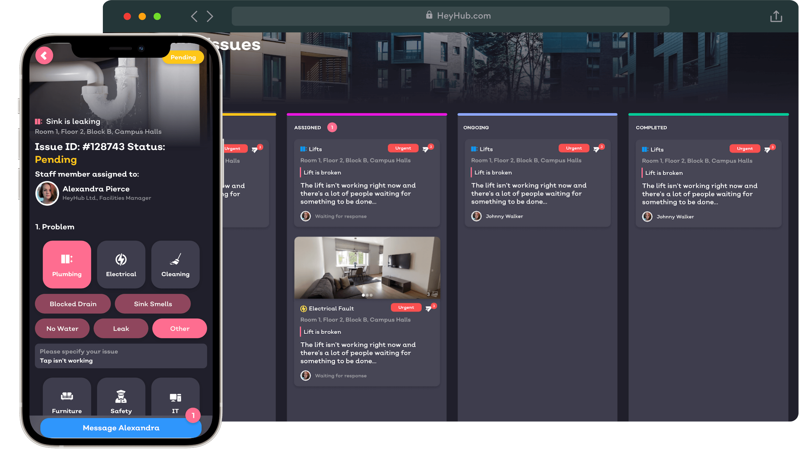 Delegating reported issues to the appropriate service team to resolve based on issue type, i.e. plumbing, safety, I.T., cleaning, furniture etc.